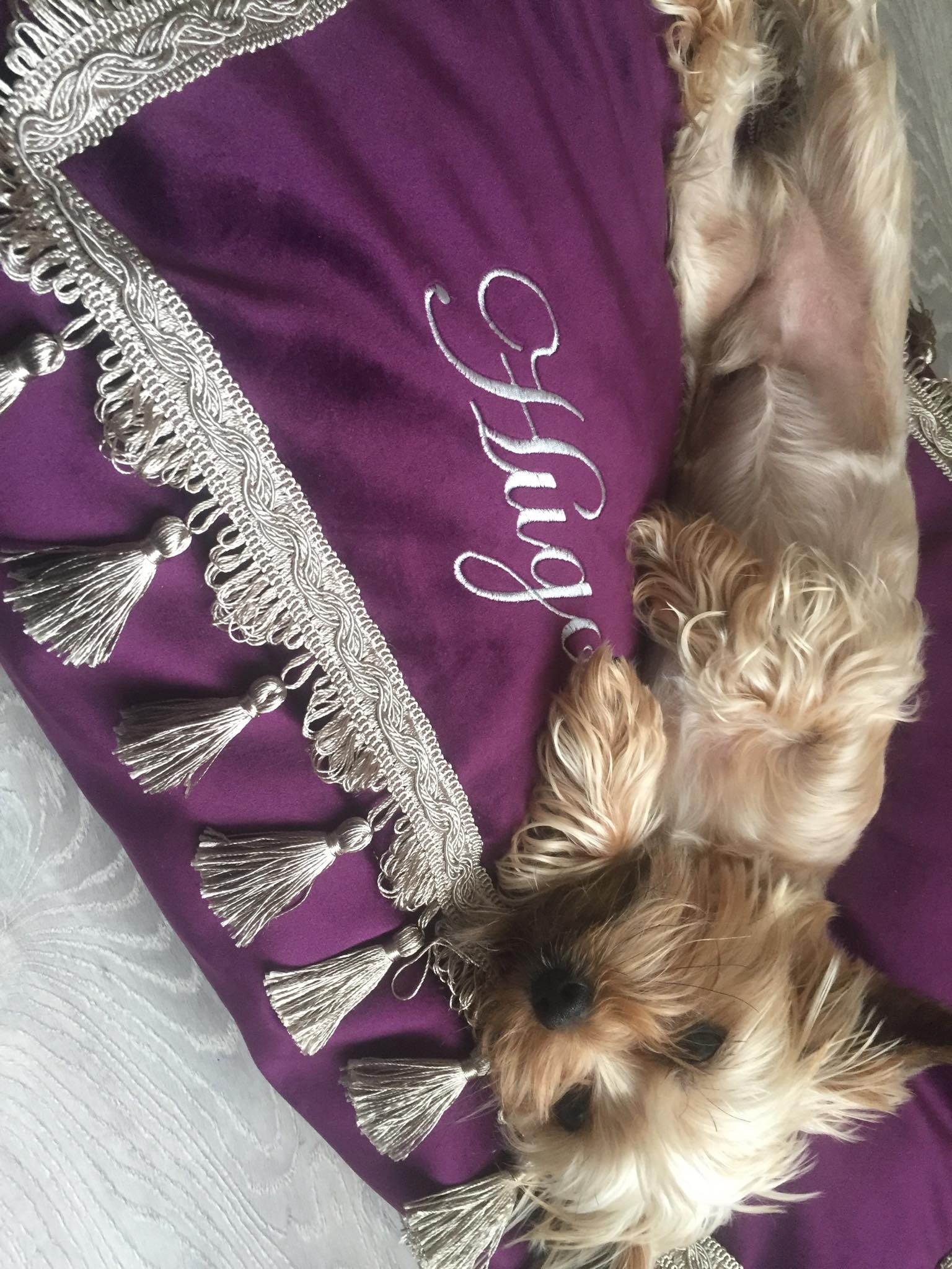 - Jeigu norite papildomo siuvinėjamo teksto ant savo guoliuko, pridėkite į krepšelį prekę, pavadinimui "Vardo siuvinėjimas" ir įrašykite savo augintinio vardą.