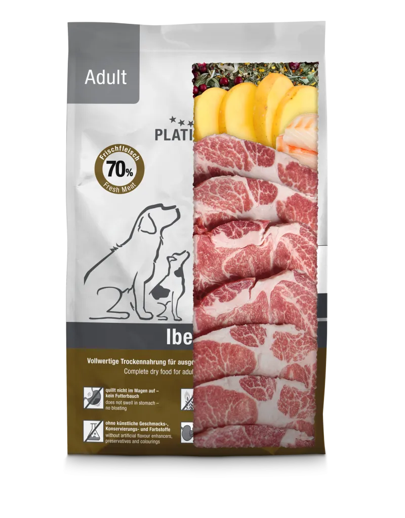 PLATINUM visavertis subalansuotas sausas maistas suaugusiems šunims pagamintas iš aukščiausios kokybės Iberijos kiaulienos pagal unikalią FSG (Fleischsaftgarung) technologiją. Dėka šio gamybos būdo maiste išlieka visos vertingos maistinės medžiagos ir jam suteikiamas išskirtinis skonis.