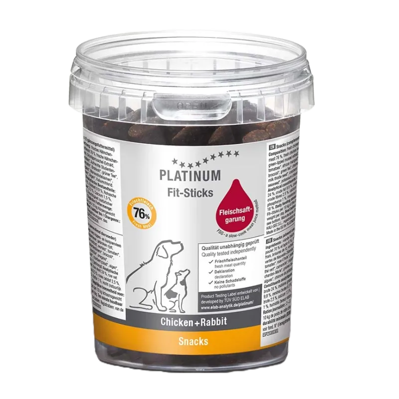Mūsų minkšti ir kramtomi PLATINUM Fit-Sticks Chicken+Rabbit skanėstai yra pagaminti naudojant FSG (Fleischsaftgarung) technologiją ir puikiai tinka kaip atlygis ar treniruočių skanėstas.