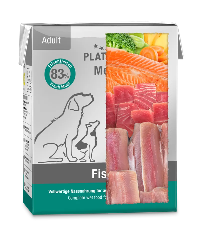 Virti lėtai savose sultyse, PLATINUM MENU su žuvimi drėgnumas 68% idealus šuniui. Jūsų šuniui tai patiks! Aromatas išlieka nuo pirmo iki pat paskutinio kąsnio.