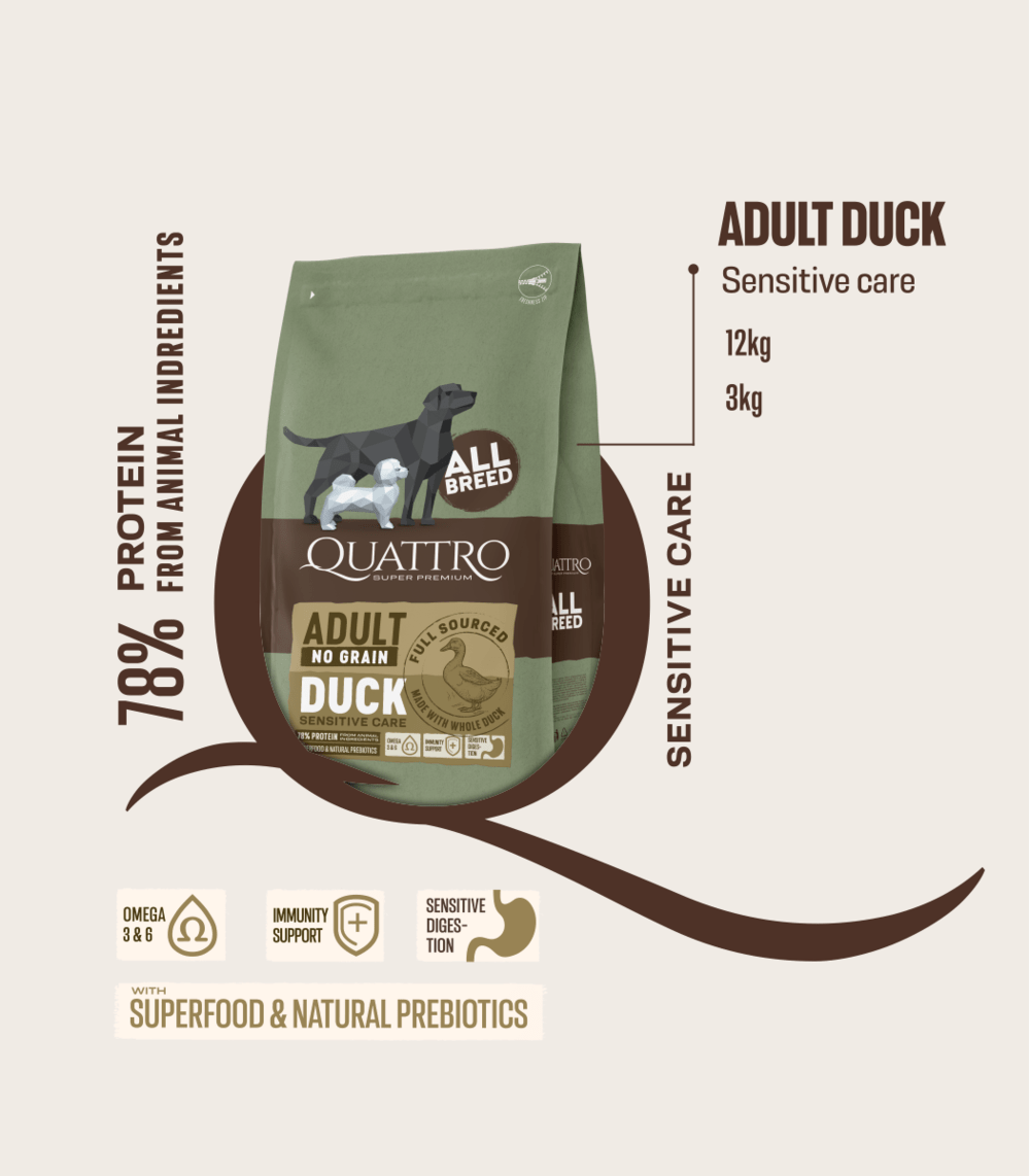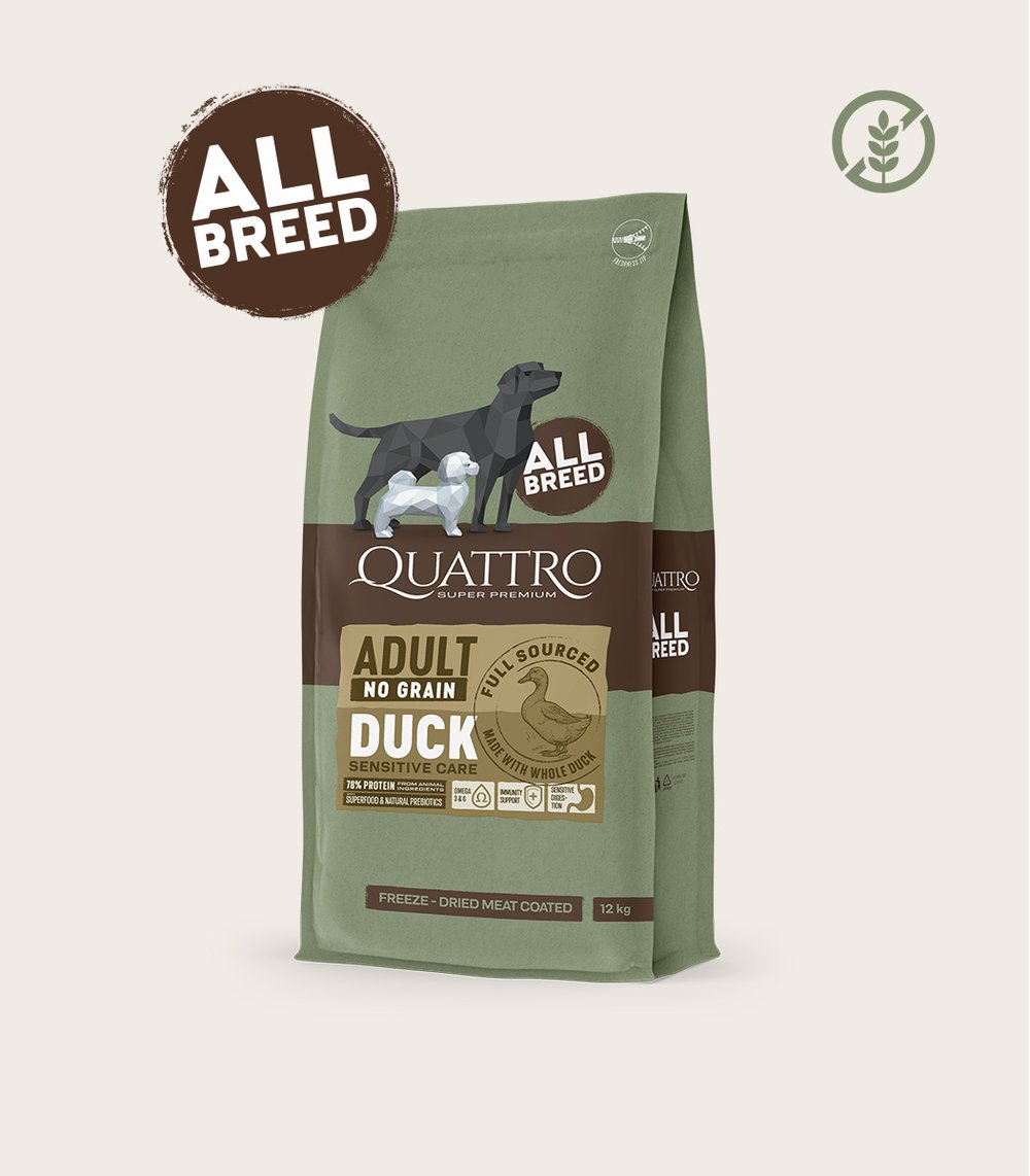 NO GRAIN. QUATTRO visų veislių asortimentas pagamintas be grūdų, tokių kaip kviečiai, soja, miežiai ir kitos alergines reakcijas sukeliančios medžiagos (glitimo, GMO).