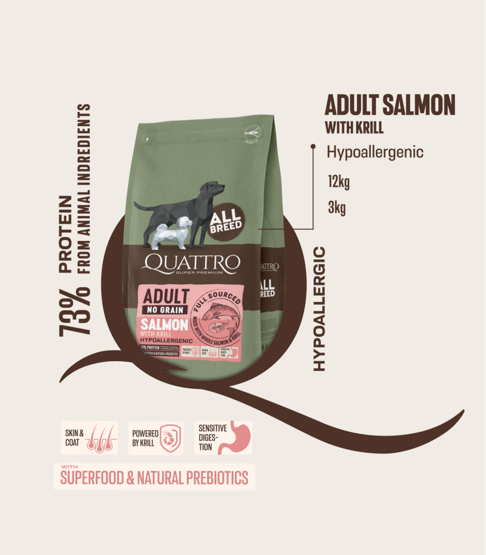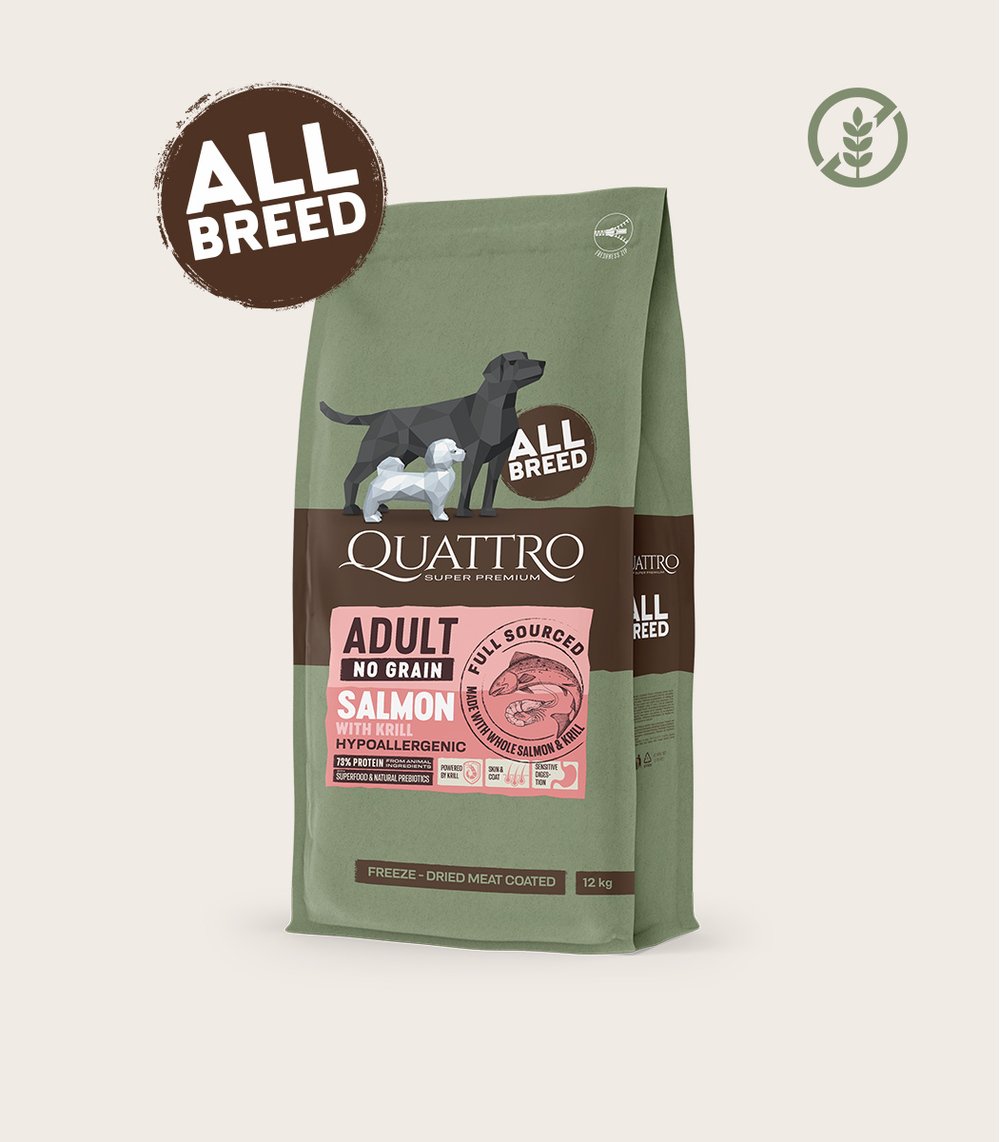 Quattro begrūdis visų veislių suaugusių šunų pašaras su lašiša ir kriliu