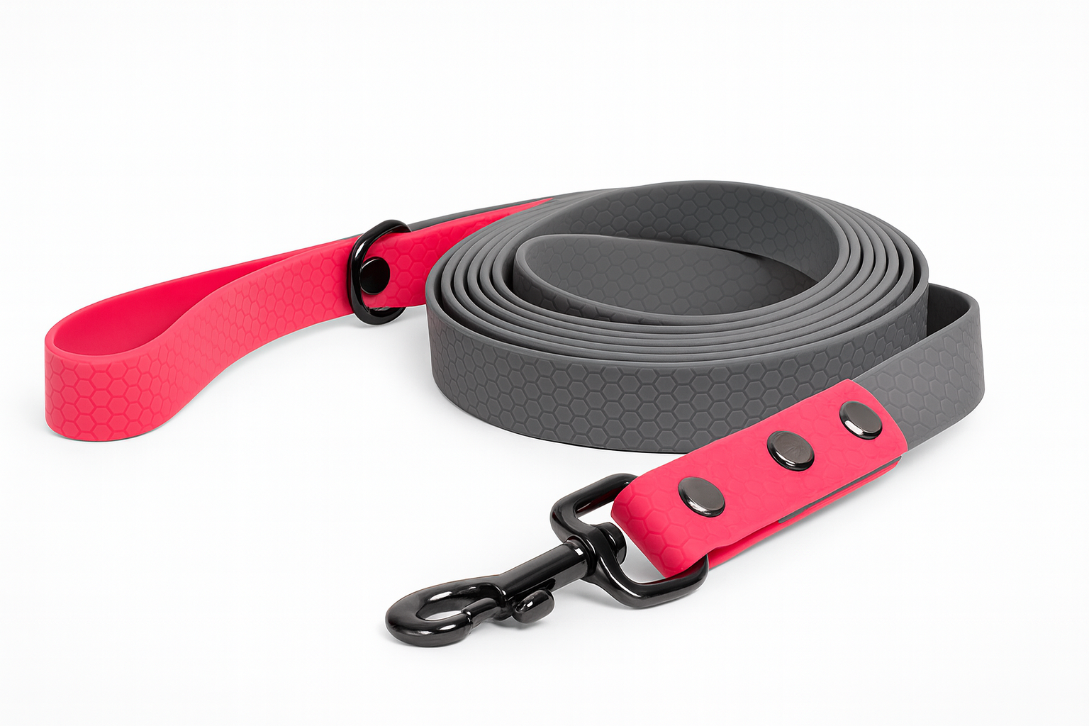 Pavadėlis pagamintas iš HEXA juostos – tai itin tvirta, patogi ir lengvai prižiūrima juosta su korėtu (šešiakampiu) raštu iš abiejų pusių, padengta PVC danga. Ji yra daug patvaresnė nei įprasta polipropileninė juosta: